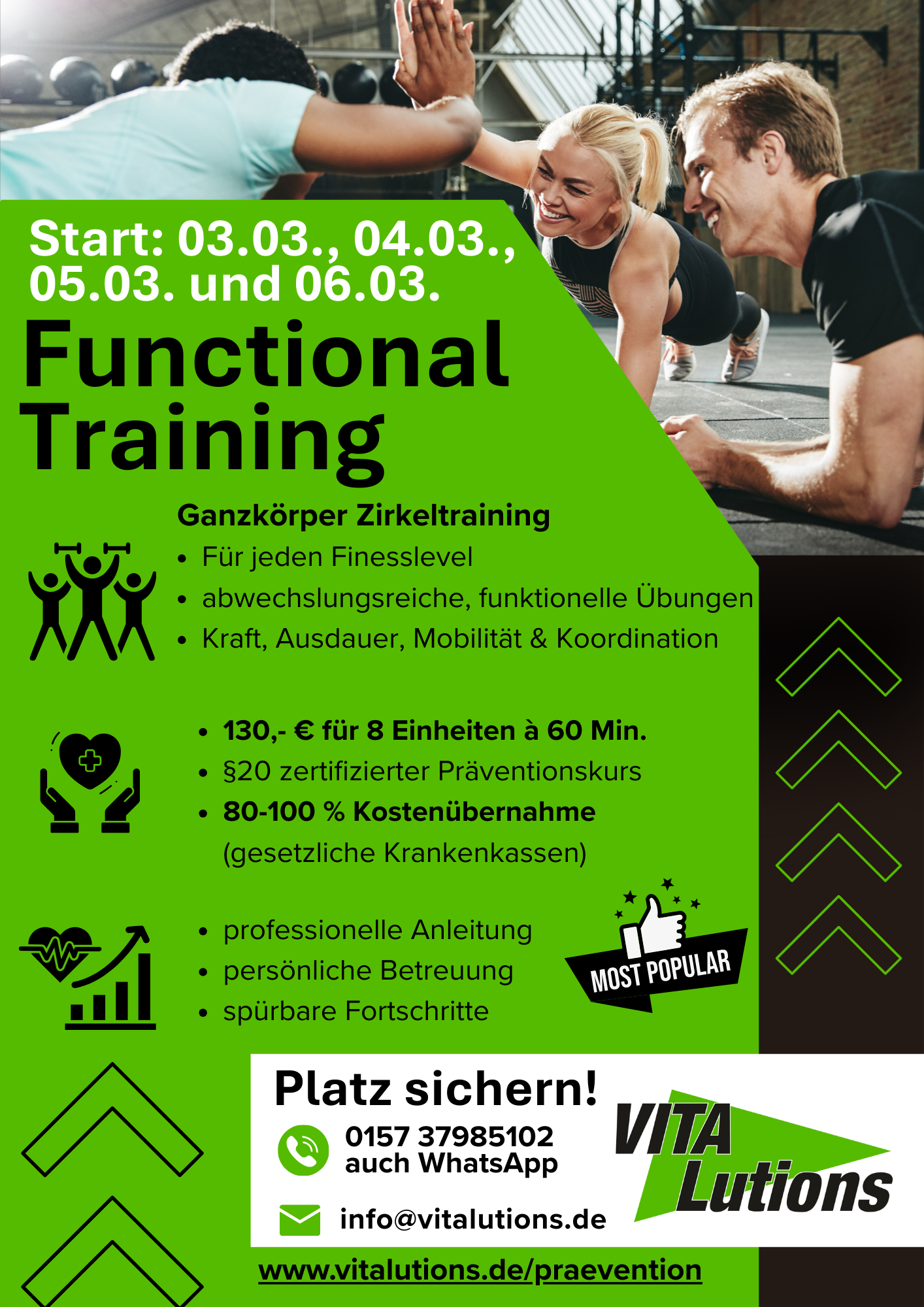 Unser Kurskonzept ist als Ganzkörper-Zirkeltraining von der Zentralen Prüfstelle für Prävention nach §20 zugelassen. Sie können auf der Website Ihrer Krankenkasse direkt nach dem Anbieter VITALutions suchen und den entsprechenden Kurs suchen. Ist dieser bei Ihrer Krankenkasse gelistet (bei allen gesetzlichen Krankenkassen ist dies der Fall), können Sie eine Kostenerstattung erwarten. Die Höhe der Erstattung legt die Krankenkasse fest.